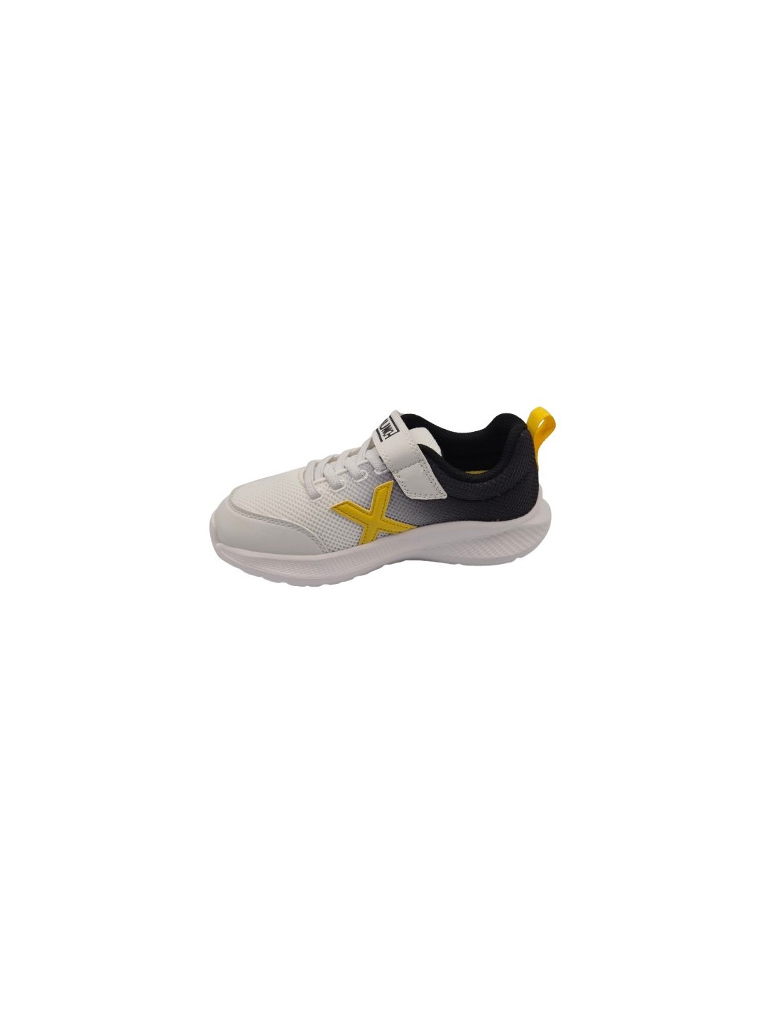 Zapatillas deportivas con velcro para niños, marca Munich, en color blanco con amarillo y azul. Munich