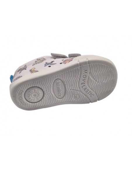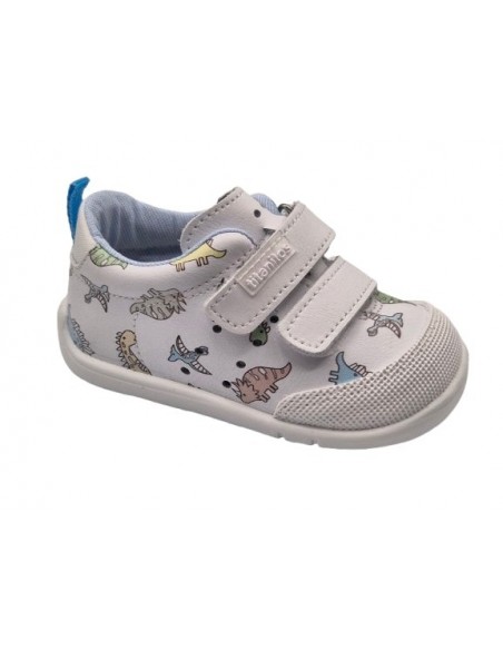 Zapatillas barefoot respetuosos para niños marca Titanitos, en color blanco con dinosaurios. Titanitos B 500 Dinosaurios